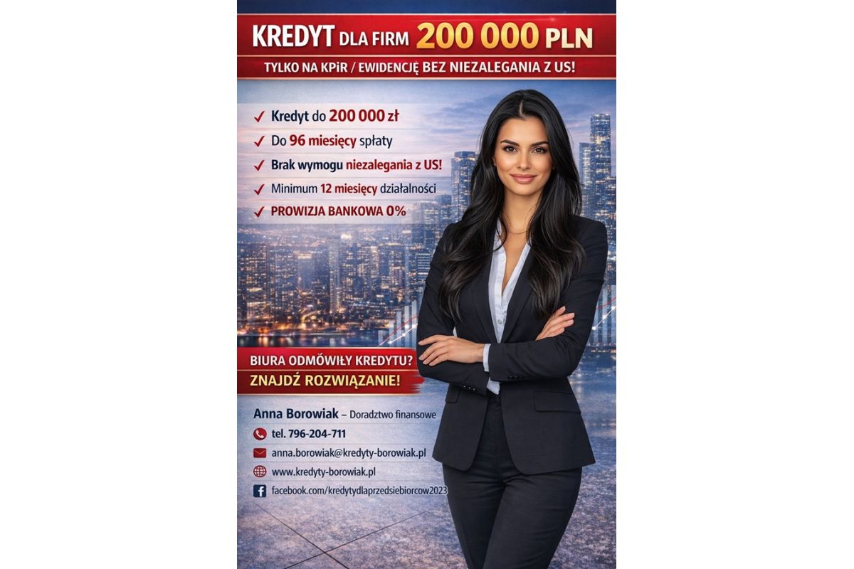 KREDYT DLA FIRM DO 200 000 PLN TYLKO NA KPiR lub EWIDENCJĘ, BEZ NIEZALEGANIA Z US!